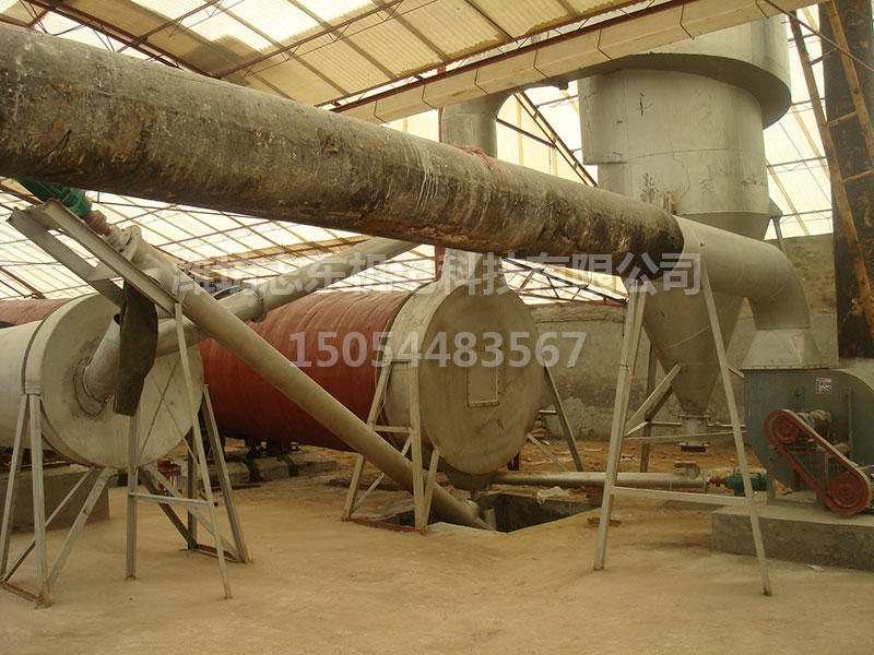 鋸末烘干機:包括熱風爐、進料口、旋轉(zhuǎn)筒、過濾筒、物料輸送管、冷卻筒和出料口;其中旋轉(zhuǎn)筒位于主動滾輪上,主動滾輪靠電機及減速傳動帶動旋轉(zhuǎn)筒低速轉(zhuǎn)動,生熱爐與旋轉(zhuǎn)筒之間設有進料口,旋轉(zhuǎn)筒內(nèi)設有翻炒葉片,在旋轉(zhuǎn)筒與過濾筒相連處設有擋板,擋板上開有一小孔,過濾筒一端與旋轉(zhuǎn)筒相連,另一端與物料輸送管相連,過濾筒內(nèi)設有擋塊,過濾筒的底部設有排渣孔,冷卻筒一端通過鼓風機與物料輸送管相連,另一端與出料口相連。由于采用上述結(jié)構(gòu),所以鋸末能在旋轉(zhuǎn)筒內(nèi)充分干燥,且鋸末在進入物料輸送管前再次充分散開,使水分蒸發(fā)快,擋塊可將鋸末中的雜質(zhì)擋住,###進入物料輸送管中鋸末的質(zhì)量。鋸末進入鋸末烘干機內(nèi)由噴吹管與回轉(zhuǎn)筒體共同作用,在筒內(nèi)沸騰流化,熱風與物料充分觸,完成干燥。